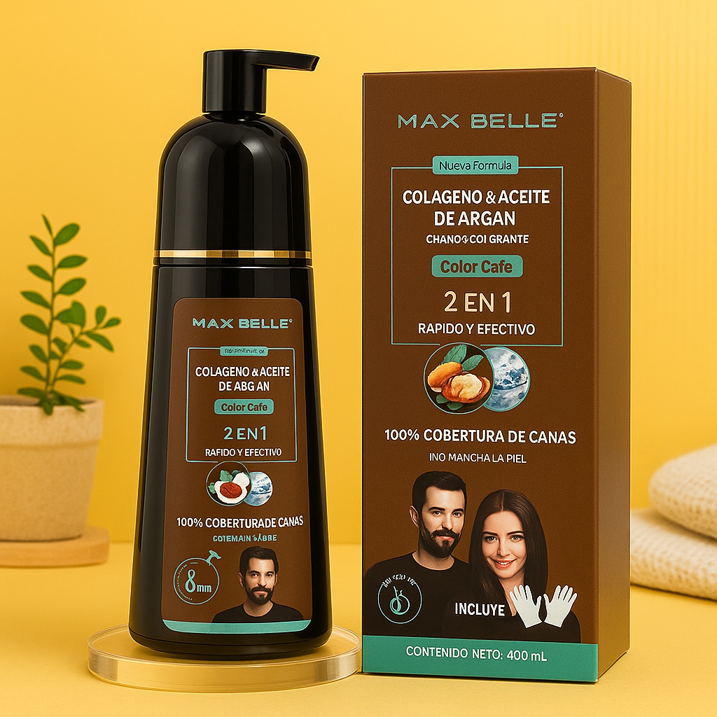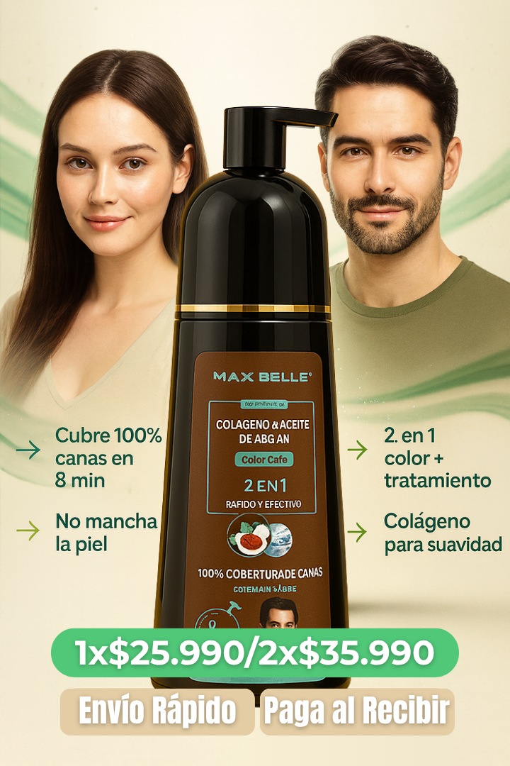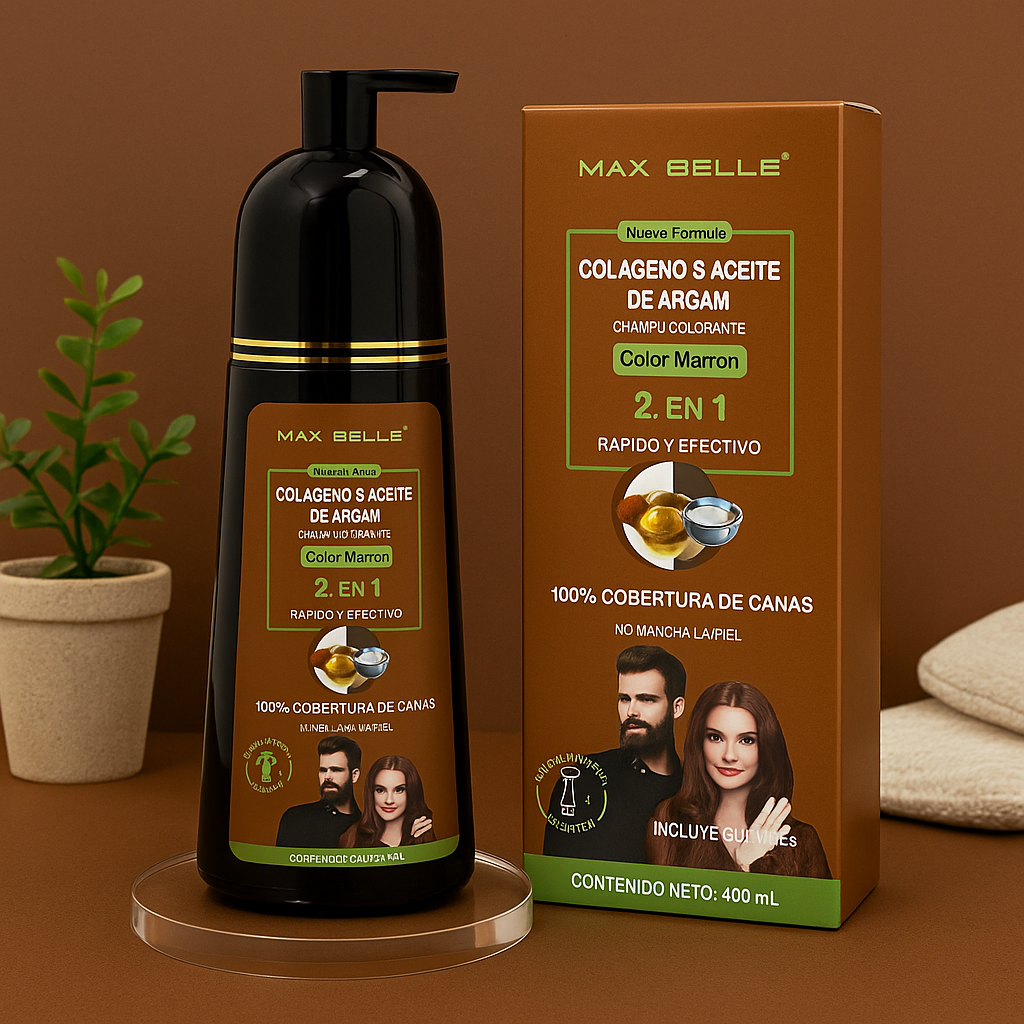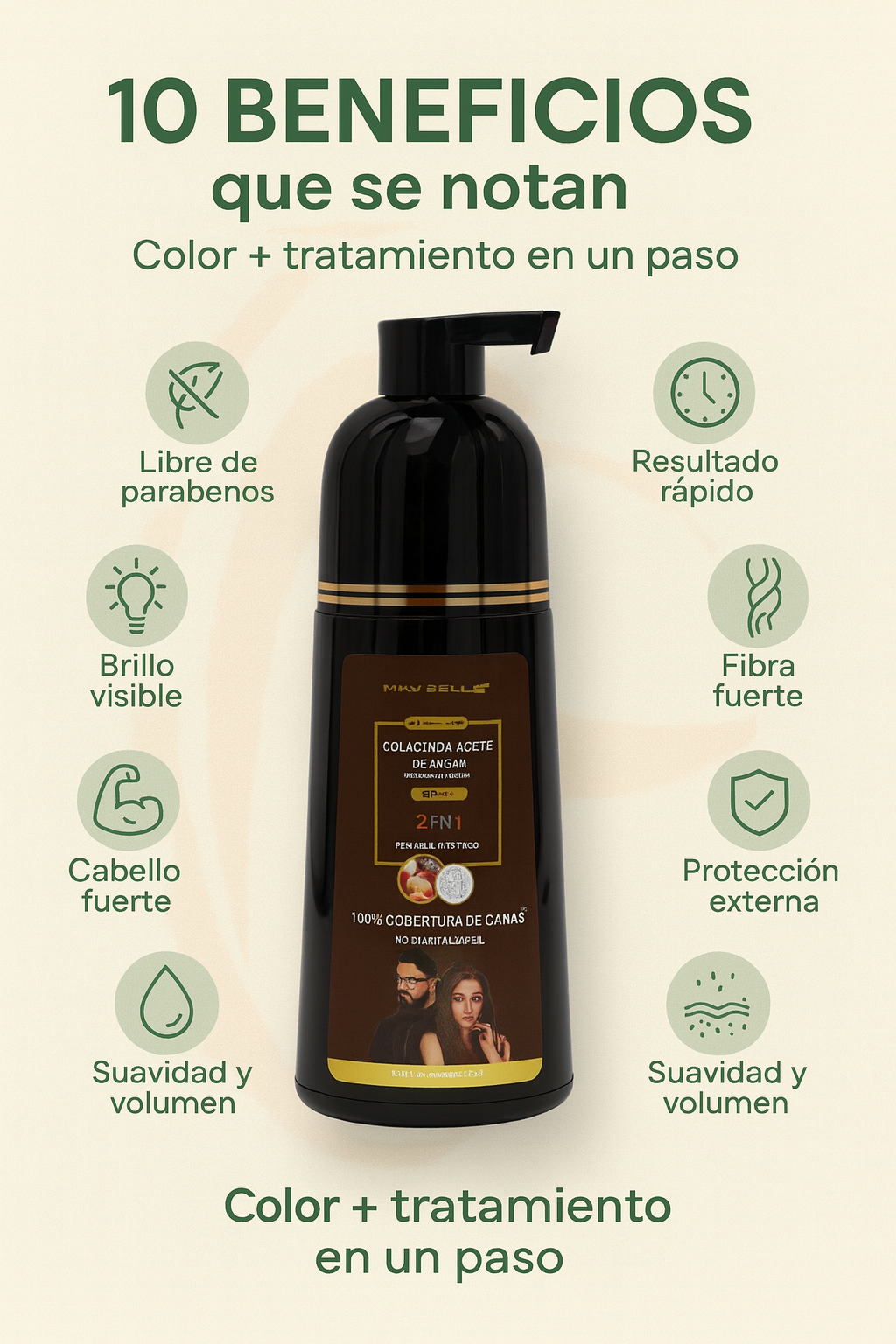 Todo lo contrario. A diferencia de los tintes convencionales que contienen amoníaco y químicos agresivos que resecan y quiebran el cabello, nuestro champú colorante está enriquecido con Colágeno Hidrolizado y Aceite de Argán Puro. Mientras colorea, estos ingredientes están REPARANDO y NUTRIENDO tu cabello. El colágeno fortalece la fibra capilar desde adentro, reduce la caída y devuelve elasticidad. El argán hidrata profundamente, aporta brillo intenso y suavidad sedosa. El resultado: cabello no solo sin canas, sino visiblemente más saludable, fuerte y brillante que antes.